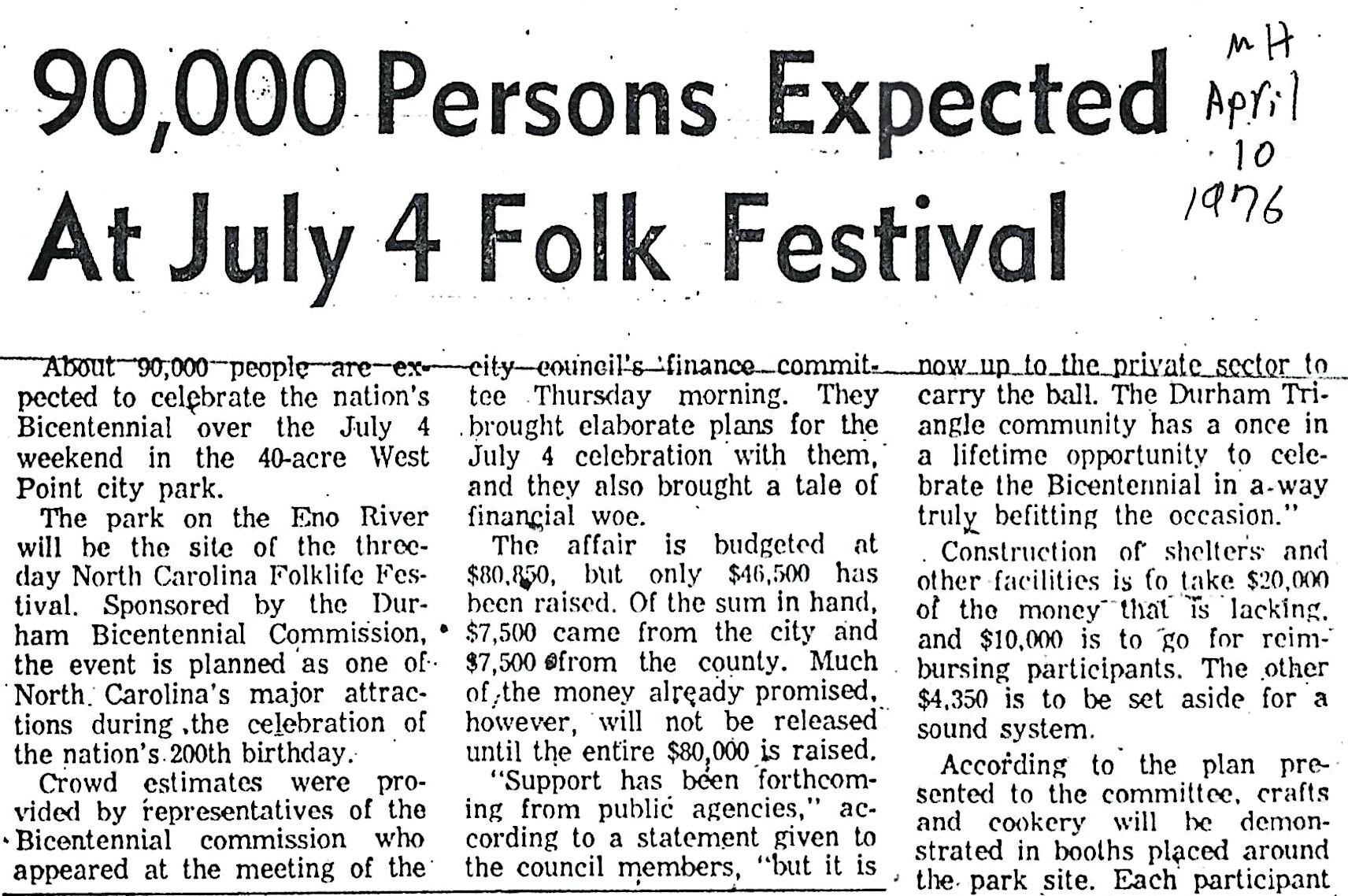 The success of the Folklife Festival led to additional festivals in the following years, including a 1978 festival produced under the direction of the state’s newly established Office of Folklife Programs. This growing momentum helped establish West Point as a hub for cultural events and ultimately inspired the first Festival for the Eno, held there on July 4, 1980—beginning a tradition that has continued for decades.