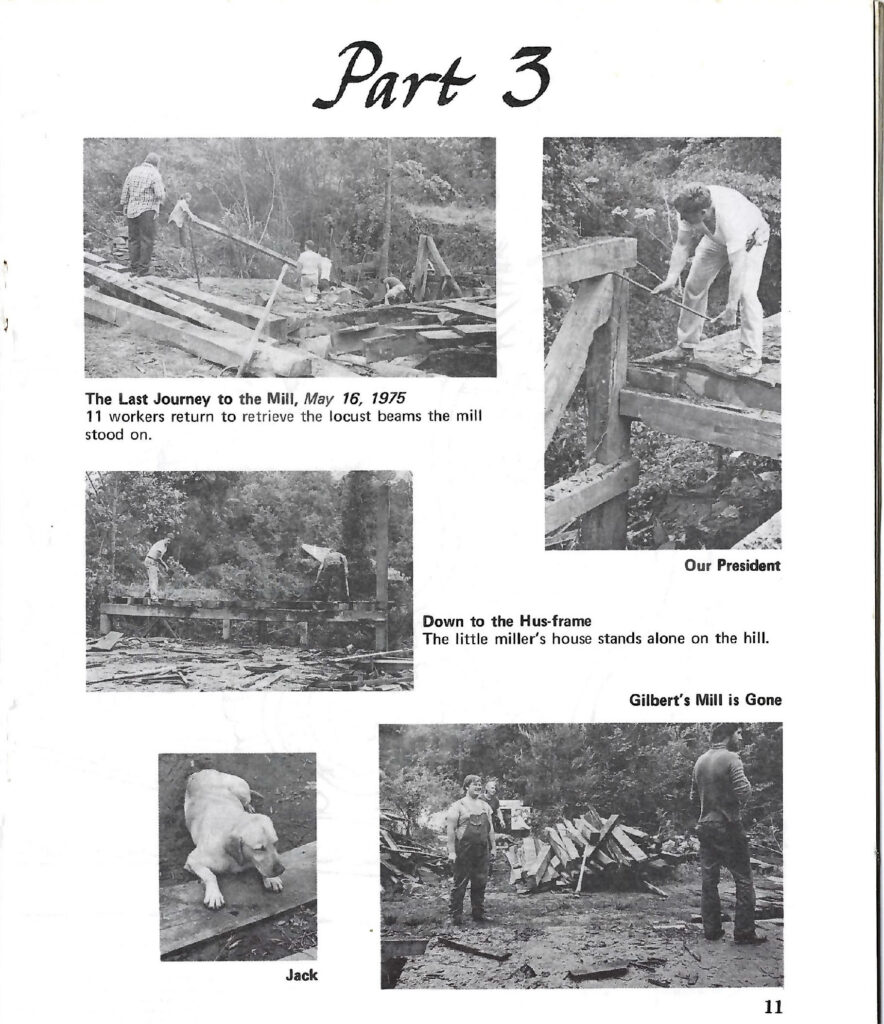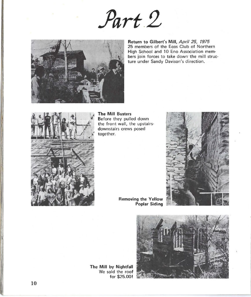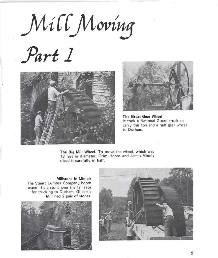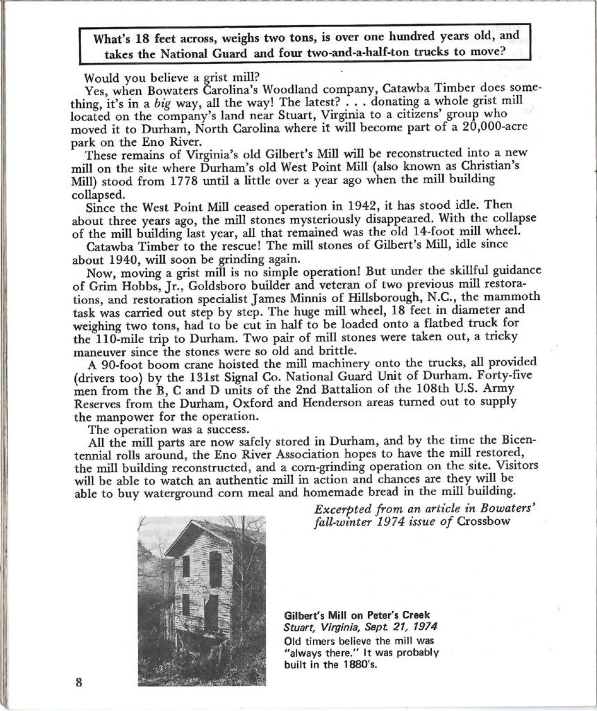 In 1973, as plans for the park and restoration were underway, the mill collapsed. Using historic photographs and salvaged materials, the mill was reconstructed—incorporating parts transported from Gilbert’s Mill in Stuart, Virginia. The 18-foot, two-ton mill wheel had to be cut in half for the 110-mile journey to Durham. This reconstruction was guided by Grim Hobbs Jr. and restoration specialist James Minnis.