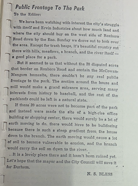 Before demolition of the estate house could occur, the ERA successfully advocated for an Environmental Impact Statement. This effort ultimately led Ervin to sell the land—including the house and mill—for the creation of a city park, while proceeding with commercial development on the opposite side of Roxboro Road.